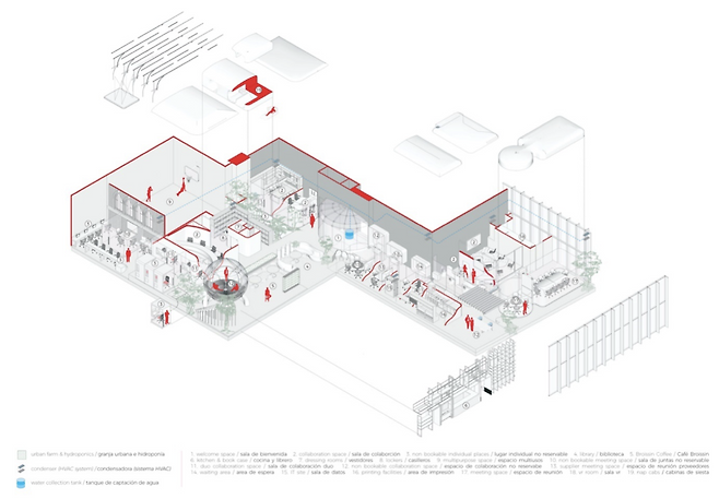 멕시코시티에 위치한 건축 스튜디오 BROISSIN의 사무실(Broissin Toreo Offices)로 기존 사무공간으로 업무를 위한 장소를 탈피하고 협업과 생산성을 극대화하며 사람들의 웰빙을 고려한 새로운 일터의 방향성을 보여준 공간입니다. 공간 곳곳 소모임을 할 수 있도록 가구 및 공간이 준비되어있고 사용자의 특성에 따라 여러 공간을 이동하며 업무를 볼 수 있는 특징이 있습니다.