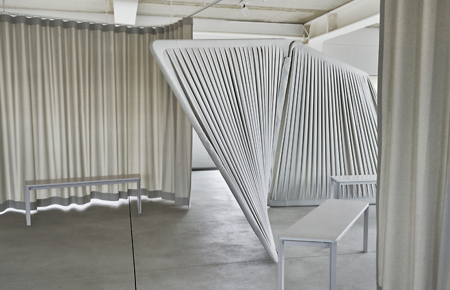 내부에는 커튼을 활용한 공간 분리는 필요에 따라 영역을 구분하면서도, 폐쇄적이지 않은 개방감을 유지합니다. 간결하고 현대적인 분위기가 돋보이는 작업 공간과 밝은 색상의 커튼, 간결한 가구 배치는 공간의 유연성을 보여줍니다. 자연광이 들어오는 창문은 실내를 환하게 밝혀주며, 공간에 따뜻함을 더합니다.