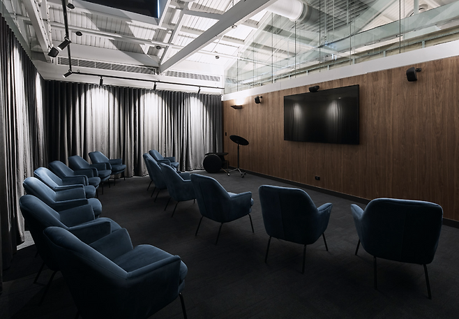 협업 및 소모임 공간은 의자를 배치한 회의 형식으로 구성되어 있으며, 필요에 따라 커튼으로 분리하거나 통합할 수 있는 구조입니다. 이는 공적인 이벤트부터 사적인 모임까지 다양한 목적으로 공간을 활용할 수 있음을 보여줍니다. 창문을 통해 들어오는 자연광과 함께 녹색 식물들이 공간에 생기를 더합니다. 이런 요소들은 실내 환경에 자연스러움을 더하고, 사용자들이 더 편안한 분위기 속에서 시간을 보낼 수 있도록 돕습니다.