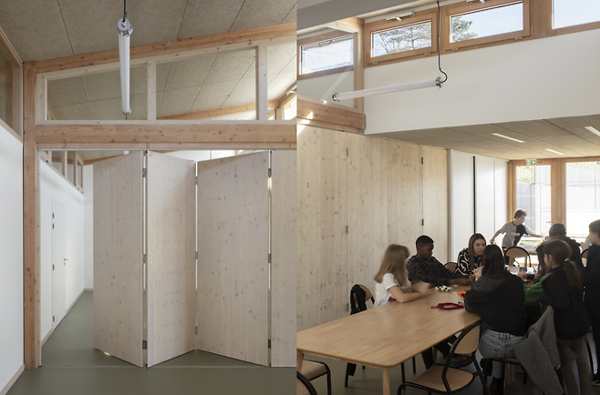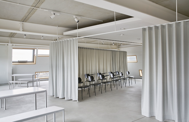 1층은 중앙의 안뜰을 중심으로 설계되어 있어, 안락함과 개방감이 조화를 이루고 있습니다. 공원을 향해 배치된 사회문화센터는 누구나 쉽게 접근할 수 있도록 설계되었습니다. 2층은 다목적 홀이 독립된 공간으로 자리 잡고 있으며, 공공성을 강조하는 건물의 특성답게 이웃 간의 교류와 소통을 활성화할 수 있는 장소로 설계되었습니다. 그리고 이 공간의 특성 중 하나인 접이식 파티션이 있습니다. 내부 공간 중앙에 배치된 파티션을 열고 닫아, 공간을 확장하거나 축소할 수 있습니다. 또한 높은 천장은 내부에 풍부한 자연 채광을 제공하며, 대형 유리창을 통해 외부의 아름다운 경관이 실내로 스며들게 만들어 줍니다.