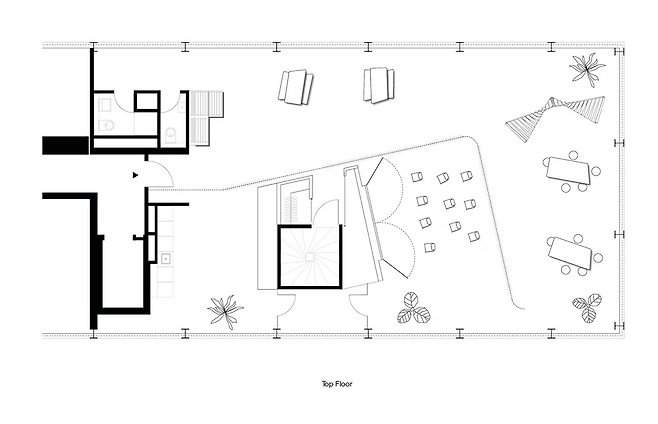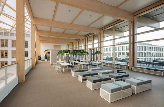 새롭게 설계된 작업 공간은 건물의 유산적 특징을 존중하면서도 현대적인 기능성을 더하는 방식으로 구성되었습니다. 총 6개 층으로 이루어진 이 공간은 주로 개방형 작업 공간으로 계획되었으며, 밀폐된 공간이 필요한 경우에는 독립적인 목재 파빌리온 형태로 디자인되어 건물의 기존 구조와 조화를 이룹니다.