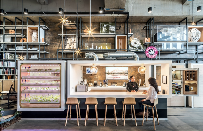 조명 역시 자연스러운 하루의 흐름에 맞게 설계되었습니다. 내부 공간의 조명은 외부 빛의 변화를 반영하며, 시간의 흐름에 따라 점점 줄어들어 사용자들의 생체 리듬을 방해하지 않도록 배려했습니다. 또한, 내부 중앙에는 도심 농장과 수경재배 선반이 자리 잡고 있어 지속가능성과 생명력을 느낄 수 있는 장소로 만들어 줍니다.