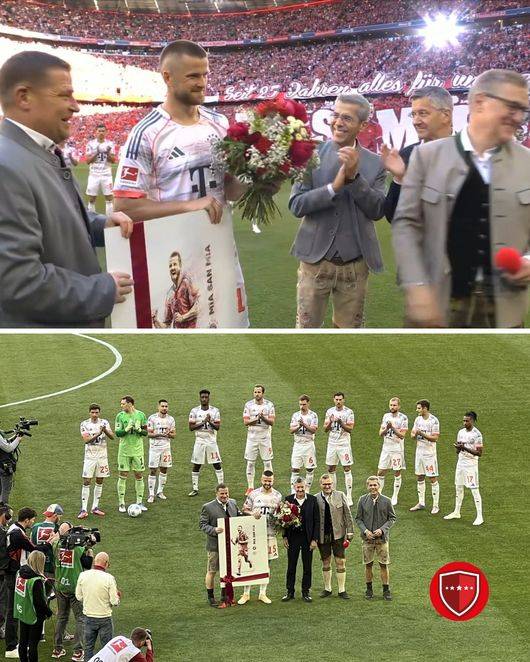 바이에른 선수들은 다같이 시상대에 올라 대망의 트로피 수여식을 진행했다. 먼저 주장 마누엘 노이어가 이번 시즌을 끝으로 팀을 떠나는 '전설' 토마스 뮐러에게 트로피를 건넸다. 뮐러는 뜨거운 기립박수를 받으며 마이스터샬레(분데스리가 우승 트로피)를 번쩍 치켜들었다. 관중석에선 환호성이 터져나왔다.