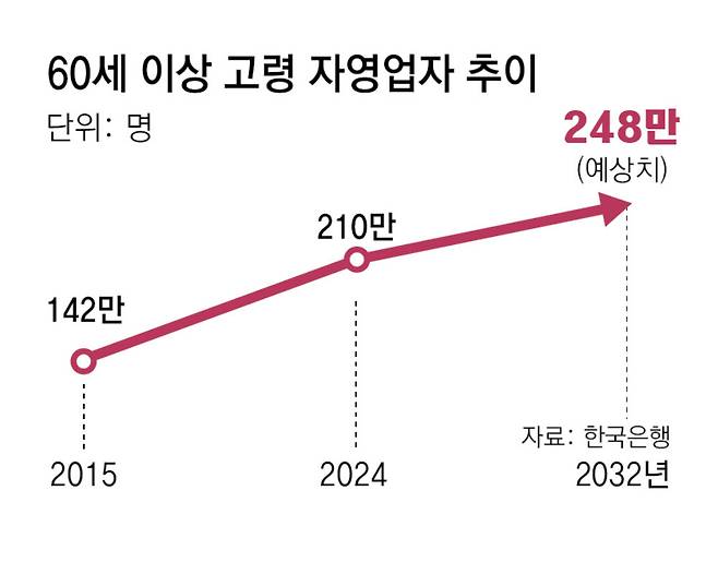 2022년 진행된 소상공인 실태조사에 따르면 60대와 70대 고령 자영업자들의 1인당 연간 매출은 각각 3000만 원과 2000만 원으로 40대 연간 매출액(4600만 원)을 크게 밑돌고, 60대 신규 자영업자의 35%는 연간 영업이익이 1000만 원에 미치지 못하는 것으로 나타났다.