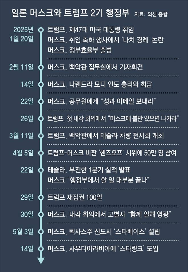 그러나 두 사람은 지금까진 큰 잡음 없이 화기애애하게 지냈다. 머스크는 지난달 30일 내각회의에서 “트럼프 행정부가 미국 건국 이래 가장 위대한 정부가 될 수 있다고 생각한다”고 ‘공식적인 고별인사’를 했고, 트럼프 대통령은 “머스크가 (여론에) 부당한 대우를 받았다. 원한다면 더 (백악관에) 머물러도 된다”고 화답했다.