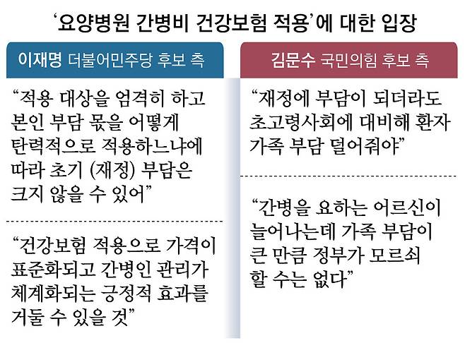 김 후보 측은 “국가 재정에 부담이 되더라도 초고령사회에 대비해 환자 가족의 부담을 덜어줄 필요가 있다”는 입장이다. 김 후보 측 관계자는 “간병비 건보 적용은 그동안에도 꾸준히 정책 수요가 있었다”며 “간병을 해야 하는 고령 어르신이 늘어나는데 가족 부담이 큰 만큼 정부 차원에서 ‘모르쇠’ 할 수는 없다”고 말했다.