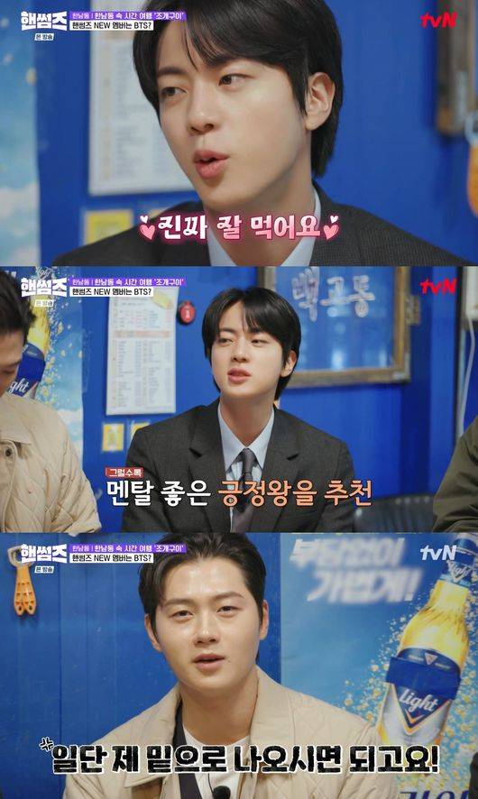 이날 진은 한남동의 조개구이 맛집에서 “내 팀 같다”며 멤버들과 금세 어울리는 모습으로 웃음을 자아냈다.