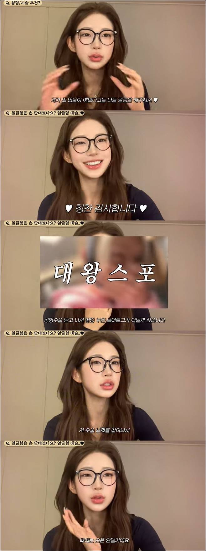 또 다른 팬은 "얼굴형은 손 안 댄 거냐. 얼굴형 예술"이라고 추천했고 최준희는 "얼굴형은 제 얼굴이다. 저는 제 얼굴형이 진짜 마음에 안 든다. 솔직히 살짝 스포를 드리면 다음 다음 브이로그가 아마도 성형수술을 받고 띵띵 부어있는 영상이 아닐까 싶다. 수술 날짜를 잡았다. 근데 뼈에는 손을 안 댈 것"이라고 또 한 번의 성형수술을 예고했다.
