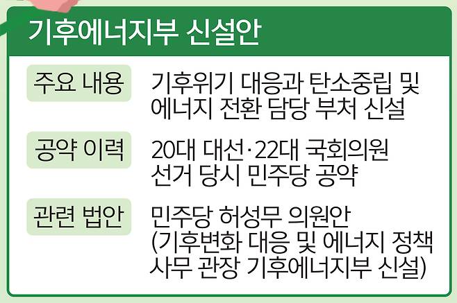 이런 문제의식에서 나온 게 기후에너지부 신설안이다. 이는 환경부 내 기후 조직과 산업부 내 에너지 조직을 각각 떼어내 새로운 부처를 만든다는 구상이다. 현재 산업부 2차관이 전력·재생에너지·원전 등 에너지 정책을 총괄하고 있다. 이미 국회에서도 민주당 허성무 의원이 올 3월 기후에너지부 신설을 골자로 한 정부조직법 개정안을 발의했다. 민주당은 2022년 20대 대선과 지난해 22대 국회의원 선거에서 이미 기후에너지부 신설을 공약했다.