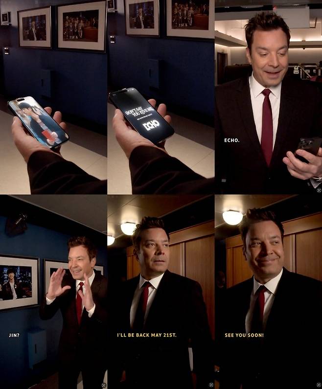 '지미 팰런쇼'는 지난 14일 밤 공식 SNS에 진의 출연을 예고하는 영상을 깜짝 게재했다. 영상에는 진행자 지미 팰런이 휴대전화로 진의 신곡 'Don't Say You Love Me' 티저를 감상하며 "ECHO…"라고 속삭이는 장면이 담겼다.