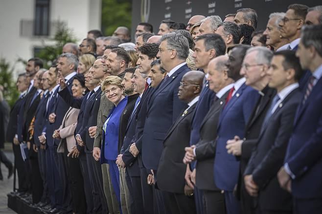 | ▲ 2024년 6월 15일 스위스 오브뷔르겐에서 열린 우크라이나 평화 정상회의에서 단체 사진을 찍고 있다. |
