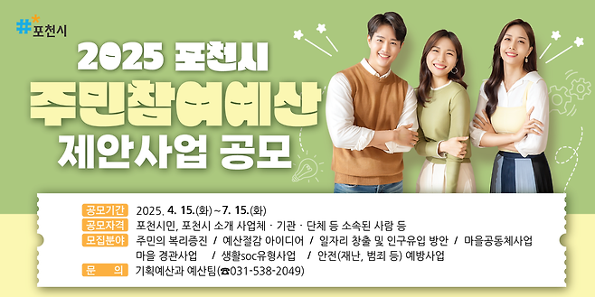 [헤럴드경제=박준환 기자]포천시(시장 백영현)가 7월 15일까지 2026년도 예산편성을 위한 ‘주민참여예산 제안사업’을 공모한다.