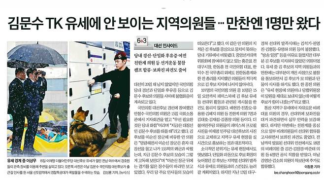 그러나 김문수의 캠페인을 어렵게 하는 요인은 윤석열만이 아니다. 한덕수 전 국무총리와의 단일화 과정에서 경북 출신임에도 불구하고 이 지역 의원들의 전폭 지지를 받지 못한 후유증이 계속되고 있다.