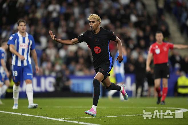 [바르셀로나=AP/뉴시스] FC 바르셀로나의 라민 야말이 15일(현지 시간) 스페인 바르셀로나의 RCDE 경기장에서 열린 2024-25 라리가 36라운드 에스파뇰과의 원정 경기 후반 8분 선제골을 넣고 세리머니하고 있다. 바르셀로나가 2-0으로 승리하면서 남은 2경기 결과에 상관없이 리그 우승을 확정했다. 통산 28번째 우승. 2025.05.16.