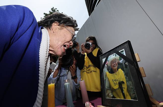 수요시위 장소 한편에 마련된 이옥선 할머니를 추모하는 장소에서 이용수 할머니는 이렇게 말했다.