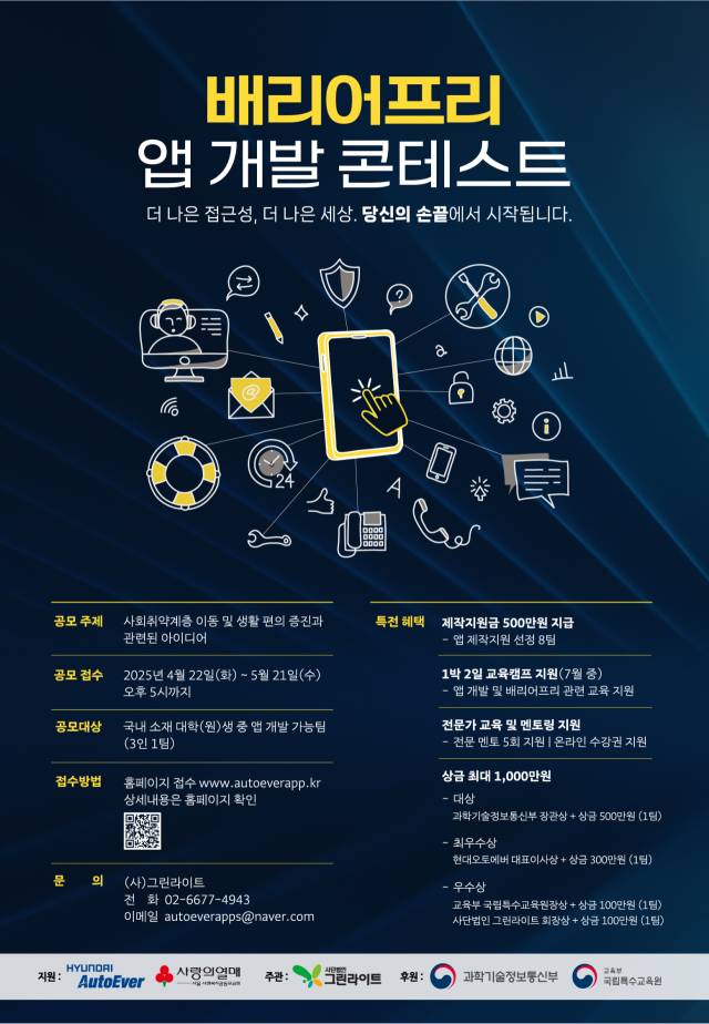 배리어프리 앱 개발 콘테스트는 사회취약계층의 이동과 생활 편의를 증진하기 위한 대학(원)생들의 아이디어를 공모한다. 현대오토에버와 그린라이트는 면밀한 심사를 거쳐 창의적 아이디어를 제시한 8팀의 앱 제작을 지원한다. 세부 지원내용은 △앱 제작지원금 500만 원 △앱 제작 관련 온라인 교육 수강권 △1박 2일의 교육캠프 △전문가 멘토링 등이다.