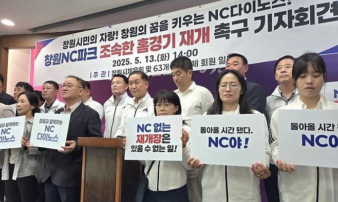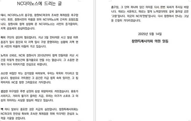 다시, NC다이노스의 홈구장, 창원NC파크의 조속한 재개장을 촉구합니다. 또한, 창원시민의 마음을 모아 NC다이노스에 간곡히 요청드립니다. 창원시와 함께 성장해 온 NC다이노스는 시민의 즐거움이자, 지역 공동체의 중심이었습니다.