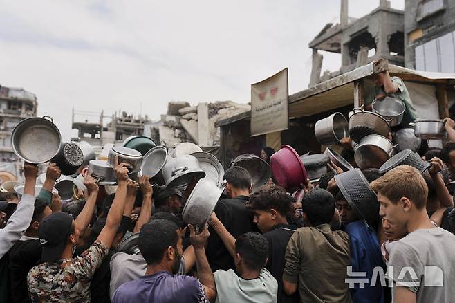 [자발리아=AP/뉴시스] 15일(현지 시간) 가자지구 북부 자발리아의 한 급식소에 팔레스타인 주민들이 음식을 배급받기 위해 몰려들고 있다. 유엔 세계식량계획(WFP)은 가자지구 내 대부분 빵집이 문을 닫았고, 자선 급식소들 또한 운영을 중단했으며, 식량 재고가 모두 소진돼 기근이 임박했다고 경고했다. 2025.05.16.