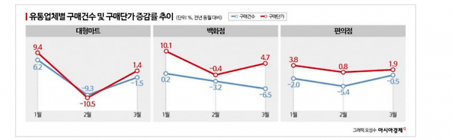 실제 산업통상자원부에 따르면 가격 저항이 가장 큰 편의점에서 올 들어 구매건수가 크게 감소한 것으로 나타났다. 편의점 구매건수는 올해 1월 전년동월대비 2% 줄어든데 이어 윤달 기저효과로 2월 5.4%까지 하락했다. 지난 3월(-0.5%) 반등하기 했지만 여전히 감소세를 이어가고 있다.