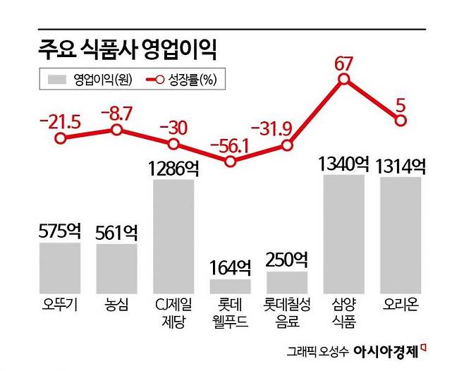 16일 국내 1위 식품기업 CJ제일제당에 따르면 이 회사의 1분기 식품사업 매출액은 2조9246억원으로 전년대비 3% 증가했지만, 영업이익은 30% 급감한 1286억원에 그쳤다. 올해 설명절이 1월 앞당겨지면서 선물세트 매출 감소와 원재료비 부담이 수익성을 악화시켰다. 이 기간 롯데웰푸드도 매출이 9751억원으로 3% 늘었지만, 영업이익이 164억원으로 56.1%나 줄었다. 국내 사업만 따지면 62.9% 줄어든 수치다. 롯데칠성음료 역시 1분기 영업이익이 31.9% 줄며 실적 악화 흐름에 합류했다.