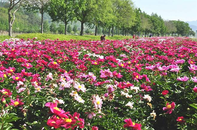 드넓은 꽃밭에 작약이 빼곡하게 꽃을 피우고 있다. 꽃을 마주하며 꽃밭사이 산책로를 거니노라니 그저 행복하다.
