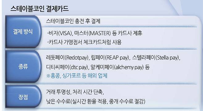 ▶레돗·스텔라·립페이 등 스테이블코인카드…카드사와 제휴 가맹점서 결제=결제 서비스를 제공하는 해외 업체는 홍콩, 싱가포르 등에 기반을 둔 레돗페이, 립페이(REAP pay), 스텔라페이(Stella pay), 디티씨페이(dtc pay), 알케미페이(alchemy pay) 등이 있다. 이들이 서비스를 제공하는 방식은 큰 틀에서 유사하다. 글로벌 카드사와 제휴해 해당 가맹점에서 결제되는 식이다. 업체 대부분은 미국 카드사 비자(VISA), 마스터(MASTER)와 제휴하고 있다.