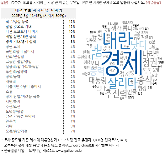 한국갤럽이 지난 13∼15일 전국 만 18세 이상 1004명을 대상으로 실시한 여론조사에 따르면, 민주당 이 후보(지지율 51%)를 지지하는 유권자들은 ‘직무·행정 능력’과 ‘잘할 것으로 기대’를 가장 큰(각 13%) 이유로 지목했다. 이어 ‘다른 후보보다 나아서’(10%), ‘계엄 심판·내란 종식’과 ‘경제 기대·경제 정책’(각 8%), ‘정권 교체’와 ‘국민의힘이 싫어서’(각 4%)라는 응답이 뒤를 이었다.