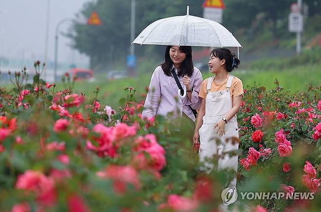 (서울=연합뉴스) 김도훈 기자 = 제17회 중랑 서울장미축제 개막일인 16일 서울 중랑구 중화체육공원에서 시민들이 인근에 심어진 장미꽃밭을 걷고 있다.