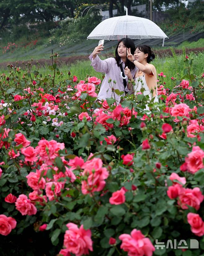 [서울=뉴시스] 조수정 기자 = 중랑 서울장미축제가 개막한 16일 오전 서울 중랑구 중화체육공원에 조성된 장미길에서 시민들이 활짝 핀 장미를 보고 있다. 2025.05.16. chocrystal@newsis.com