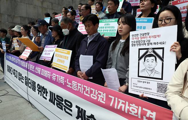 | ▲ 산재노동자의 날 기자회견 산재 피해자·유가족·노동자건강권단체들이 4월 28일 서울 광화문광장 인근에서 산재노동자의날 국가기념일 제정 원년 기자회회견을 하고 있다. |