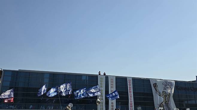 | ▲ 4월 26일 경북 구미의 한국옵티칼하이테크 공장 옥상에서 고공 농성을 이어간 해고노동자 박정혜, 소현숙씨가 '옵티칼 희망버스' 문화제 참가자들과 만나고 있다. 다음날인 27일 소씨는 건강 악화를 이유로 476일만에 농성을 중단했다. |