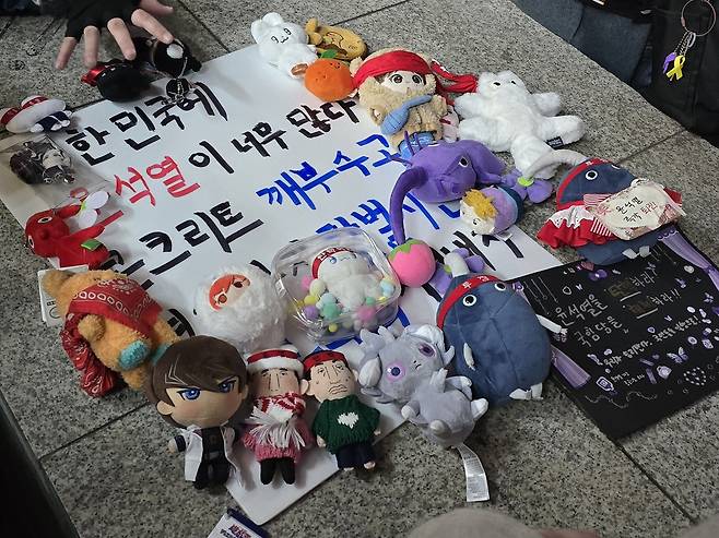 | ▲ 지난 3월 1일 대구 중구 동성로에서 열린 21차 대구시민시국대회 당시 참가자들이 가져온 인형들. 집회 참가자들은 아이돌 굿즈나 만화, 게임 캐릭터 등의 인형을 가져와 대자보 위에 올렸다. |