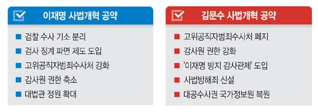 6·3 대통령 선거에서 사법개혁 공약은 더불어민주당과 국민의힘의 입장이 가장 극명하게 다른 분야 중 하나다. 이재명 민주당 대선 후보가 ‘검찰 권한 분산·고위공직자범죄수사처(공수처) 강화’에 방점을 찍고 있다면, 김문수 국민의힘 대선 후보는 ‘공수처 폐지·감사원 강화’를 강조하고 있다. 각 진영이 당리당략에 따라 사법·사정기관에 대한 보복성 공약을 남발하고 있다는 지적도 나온다.