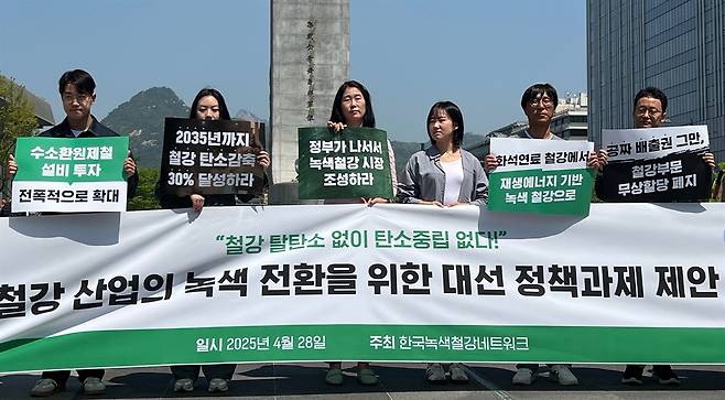 | ▲ 4월 28일 광양환경운동연합, 기후넥서스, 기후솔루션, 빅웨이브, 충남환경운동연합, 포항환경운동연합, 환경운동연합 등 기후환경 단체가 참여하는 한국녹색철강네트워크는 서울 광화문광장에서 기자회견을 열고 철강의 탈탄소 전환을 위한 4대 정책 제안을 발표했다. |