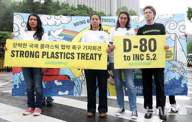 [서울=뉴시스] 김선웅 기자 = 플라스틱 원료 운반 탱커선 마스트에 올라 플라스틱 협약 촉구 시위를 벌이다 출국이 금지되고 재판에 넘겨진 국제환경단체 그린피스 활동가들이 첫 재판을 마친 16일 서울 서초구 서울중앙지법 앞에서 기자회견을 열고 국제 플라스틱 협약을 촉구하고 있다. 2025.05.16. mangusta@newsis.com