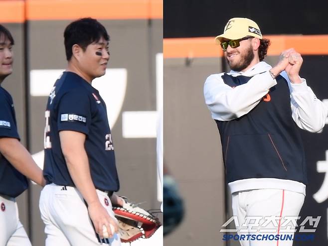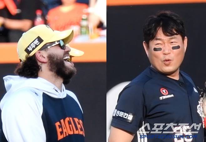 [대전=스포츠조선 정재근 기자] '베프' 양의지와 류현진이 있기 때문에…독수리와 곰이 만나면 훈훈한 풍경이 만들어진다. 여기에 폰세까지 합류하니 더 유쾌한 분위기가 연출됐다.