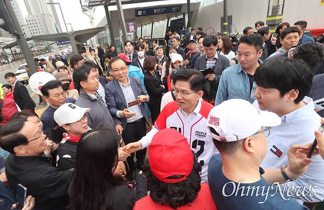 | ▲ 김문수 국민의힘 대선 후보가 16일 경기 화성시 동탄역 앞에서 광역급행철도(GTX) 전국화 공약 발표를 마치고 시민들과 인사를 나누고 있다. |