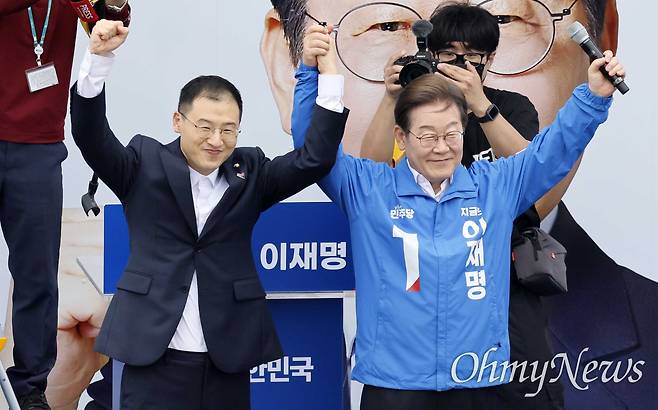 | ▲ 이재명 더불어민주당 대선 후보가 16일 전북 익산역 동부광장 유세에서 유권자들에게 지지를 호소하고 있다. 왼쪽은 이재명 후보 지지 선언을 한 김상욱 무소속 의원. |