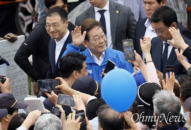 | ▲ 이재명 더불어민주당 대선 후보가 16일 전북 익산역 동부광장 유세에서 김상욱 무소속 의원과 함께 시민들에게 인사하고 있다. |