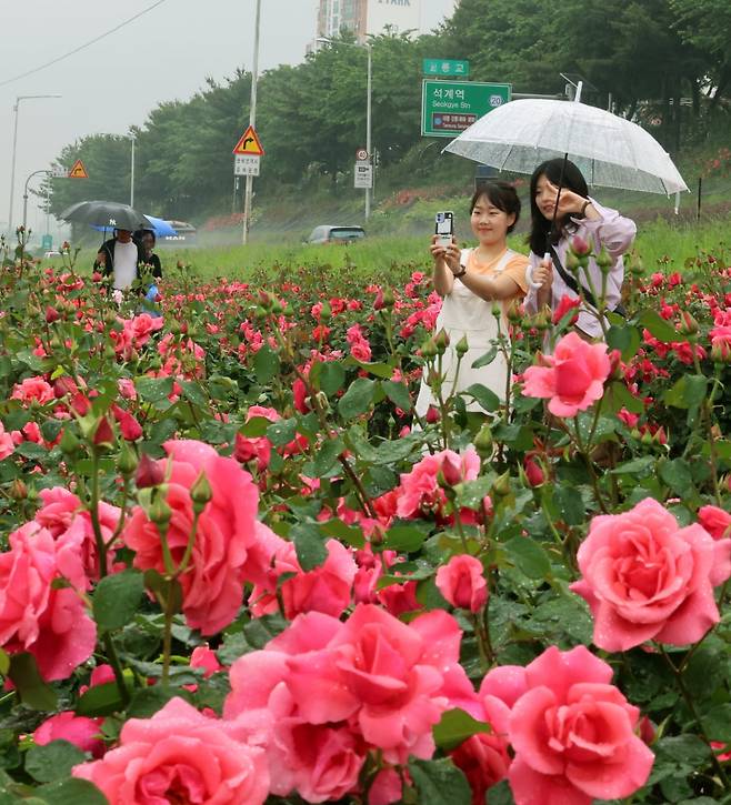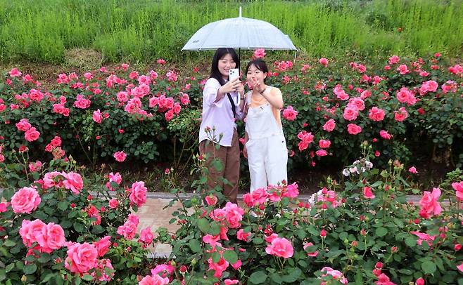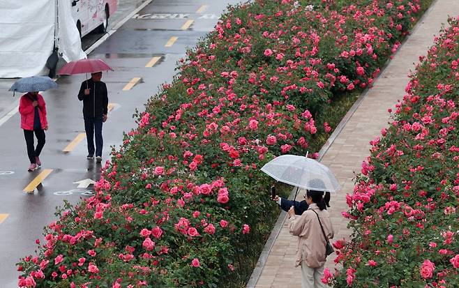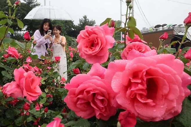 중랑 서울장미축제 개막일인 16일 서울 중화동 중화체육공원 인근에 심어진 장미꽃밭에서 시민들이 사진을 찍고 있다.