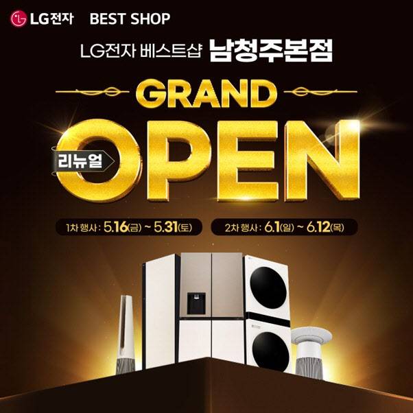 [이데일리 이윤정 기자] LG전자의 가전 유통 전문매장 ‘LG전자 베스트샵 남청주본점’은 매장 리뉴얼 그랜드 오픈 기념 대규모 가전행사를 진행한다고 16일 밝혔다. 이번 번입행사기간은 1차 행사 5월 16일부터 31일까지, 2차 행사는 6월 1일부터 6월 12일까지다.