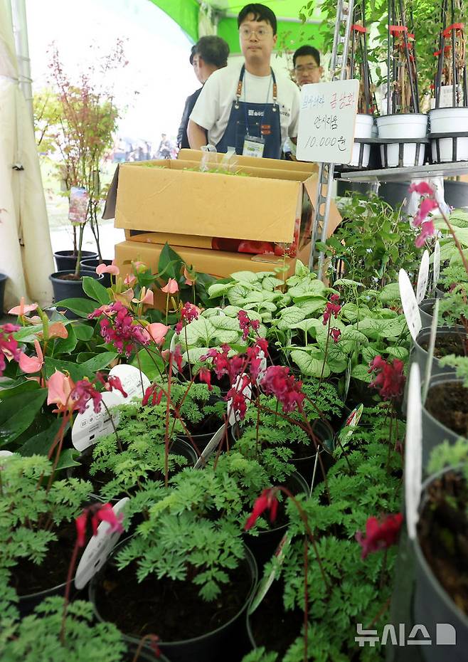 [서울=뉴시스] 추상철 기자 = 16일 오후 서울 종로구 광화문광장에서 열린 '우리 임산물 숲푸드 대축제'에 꽃과 나무 등이 진열돼 있다. 2025.05.16. scchoo@newsis.com