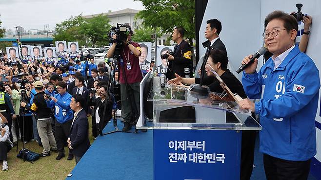 ▲ 더불어민주당 이재명 대선후보가 16일 전북 익산시 익산역 동부광장에서 열린 유세에서 지지를 호소하는 연설을 하고 있다.
