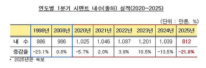한국시멘트협회에 따르면 1분기 시멘트 출하량은 812만톤(t)으로, 작년 동기 대비 21.8% 감소했습니다.