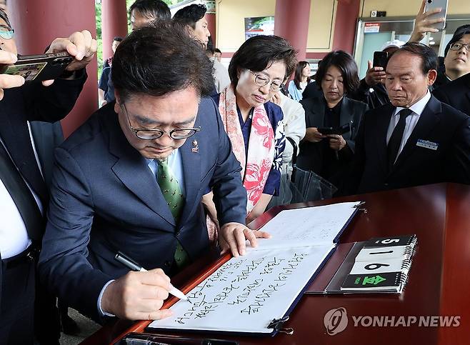 (광주=연합뉴스) 조남수 기자 = 우원식 국회의장이 16일 오후 광주 북구 국립5·18민주묘지를 찾아 참배에 앞서 방명록을 작성하고 있다, 2025.5.16