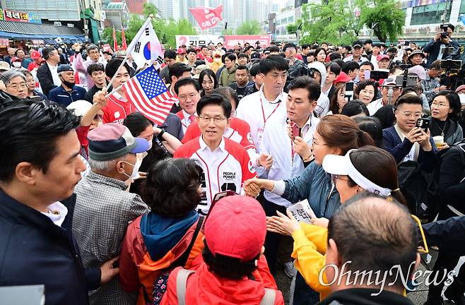 | ▲ 김문수 국민의힘 대선 후보가 16일 경기 수원시 팔달구 지동시장을 찾아 시민들과 인사를 나누고 있다. 태극기와 성조기가 눈에 띈다. |