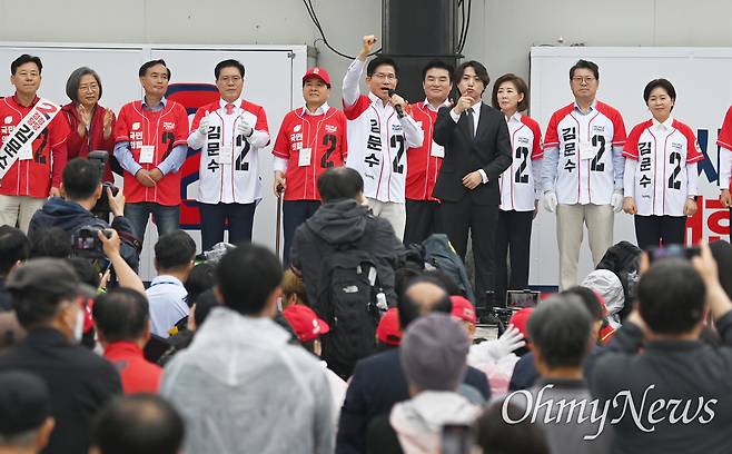 이에 대해 국민의힘 관계자는 "해당 일정을 취소하는 시점에 비가 많이 와서 오전 지하철역(판교역) 일정처럼 될까 봐 취소했다"면서도 "(유세 장소에) 미리 가 있는 사람(지지자)들이 있다는 소식을 듣고 (김 후보가) 안 가시는 건 예의가 아니라고 판단했다. 그래서 잠깐 들러서 인사만 하고 가게 된 것"이라고 설명했다.