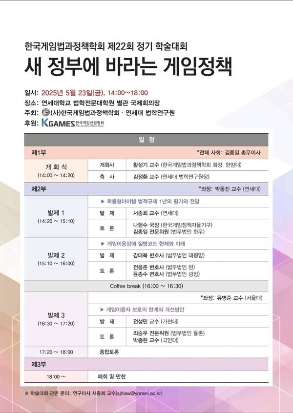 학술세미나는 한국 게임 산업의 성장과 더불어 제도적·정책적 환경에 대한 논의가 활발히 이루어지는 자리다. 특히 "새 정부에 바라는 게임정책"이라는 주제를 중심으로 학계·법조계·산업계 전문가들이 한자리에 모여 심도 있는 논의를 펼칠 예정이다.