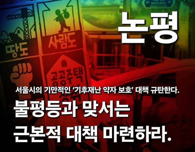 끝으로 "폭염과 폭우가 재난으로 삶을 옥죄어 올 때 약자들이 가장 먼저 쓰러진다"면서 "서울시의 파편적인 해결책으로는 기후재난 속 다층적인 위기를 돌파할 수 없다"고 지적했다. 아울러 "서울시가 해야할 일은 '눈속임식 보도자료'가 아니라 제대로된 기후재난 대책과 주적권 보장 대책을 내놓는 것"이라고 강조하며 모두가 기후재난에서 존엄하게 살아남을 수 있는 최저주거기준의 개선과 공공임대주택 확대 그리고 동자동 공공주택사업의 조속한 추진을 촉구했다.