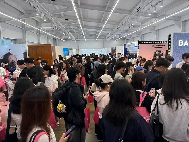 16일 오후 2시 뷰티 페스타 팝업스토어 현장에서 만난 대학생 황씨(22)는 예약 없이 이곳에 방문했다고 설명했다. 황씨 앞으로는 30여명, 뒤로는 20여명이 입장을 기다리고 있었다. 워크인 방문객이 예약 방문객의 5배 이상 많았다.